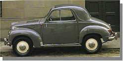 Leo CERRUTI (Two Rs and one T.) wons this 1952 Fiat 500C. It has a four cylider, 1/2L aluminum head engine, 15 HP (many lawn mowers have more!) and it does 60 MPH downhill with a strong tailwind. Note the suicide doors. Leo says it is a blast to drive.
