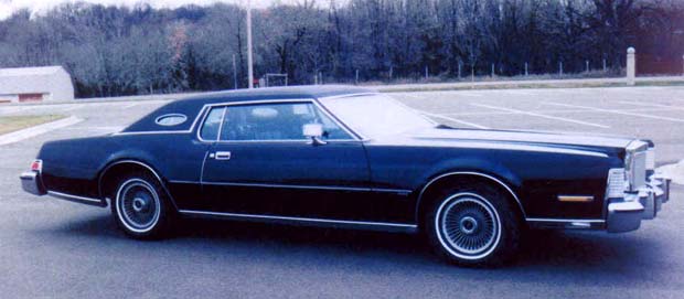 This is Jim French's 1974 Lincoln Mark IV, which he describes as the Black Beautiful Battleship. The car is triple back with black paint, black vinyl top and black interior. The car is equipped with the 460 cid engine. The car is comfortable and hunkers down its 5400 lb to the road. At this weight though, maneuverability is done more by steering committee than by steering wheel. Even so, the car is a pleasure to drive.